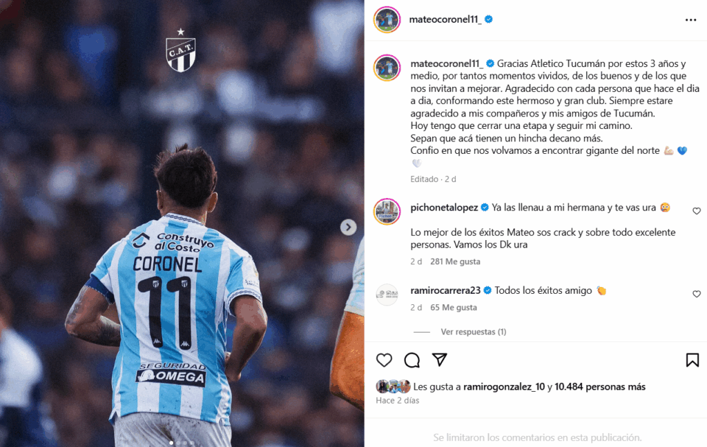 La salida de Mateo Coronel marca el fin de una etapa significativa para Atlético Tucumán. Su mensaje de gratitud y pertenencia refuerza el vínculo emocional con la hinchada, que ahora lo seguirá desde tierras mexicanas.