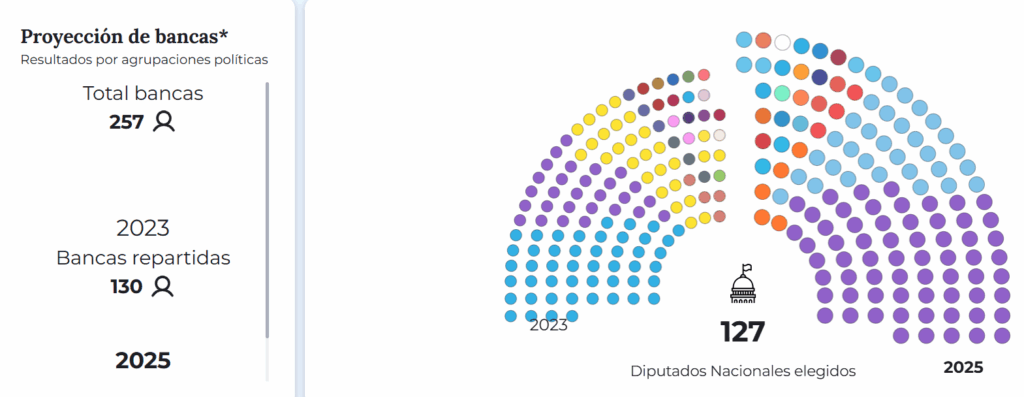 Las elecciones legislativas 2025 dejaron un mensaje claro: la Argentina eligió cambiar el tono del Congreso. Con el 40,84% de los votos, La Libertad Avanza se convirtió en la fuerza dominante en Diputados, asegurando 64 bancas y desplazando al peronismo, que quedó en segundo lugar con 31,67% y 44 bancas. El mapa político se tiñó de violeta, con victorias libertarias en 16 distritos, incluida la estratégica provincia de Buenos AiresInfobae.