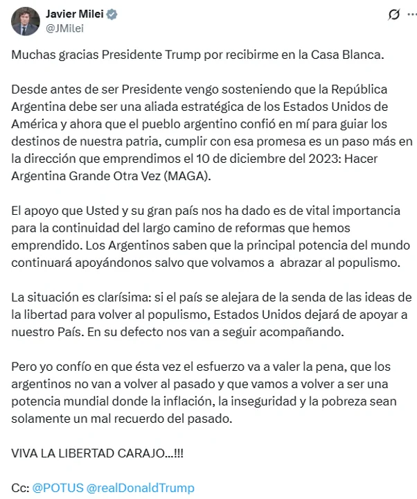 «Muchas gracias Presidente Trump por recibirme en la Casa Blanca», comenzó Milei su posteo en la red social X. Allí, reafirmó su promesa de campaña de convertir a Argentina en un «aliado estratégico» de Estados Unidos, un paso que consideró fundamental para «Hacer Argentina Grande Otra Vez (MAGA)», en un claro guiño al eslogan de su par norteamericano.