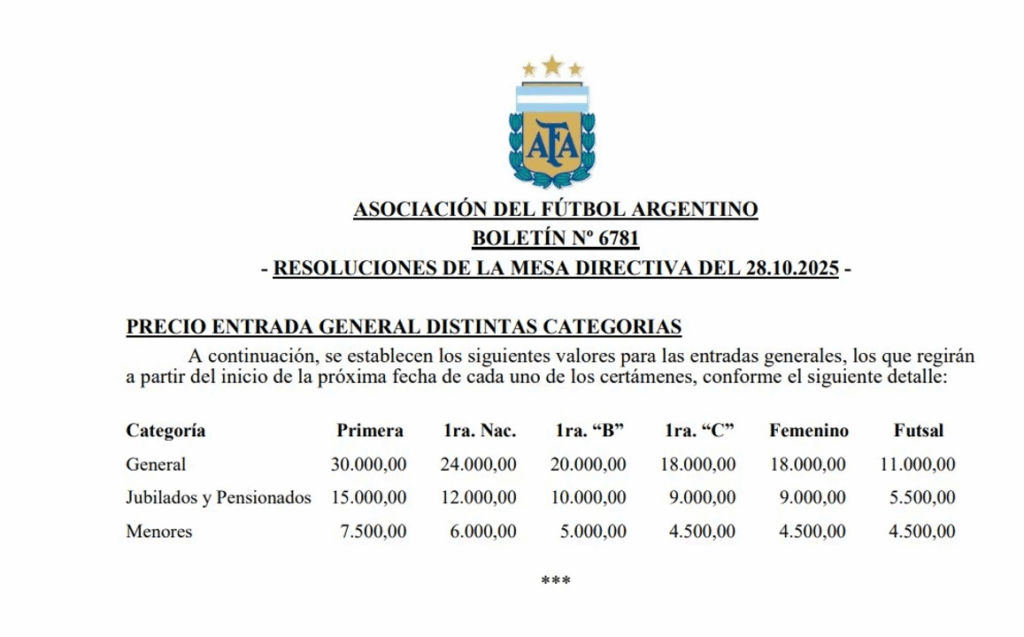 La Asociación del Fútbol Argentino (AFA) confirmó nuevos valores para las entradas del fútbol argentino con aplicación inmediata desde la próxima fecha en todas las categorías.