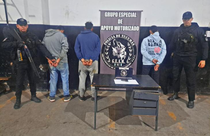 Tres jóvenes de 26, 30 y 32 años intentaron robarle a una joven a punta de pistola en calle Santa Cruz al 1100, en San Miguel de Tucumán. La víctima alertó a los motoristas de la División GEAM, que patrullaban la zona bajo jurisdicción de la Comisaría Once.