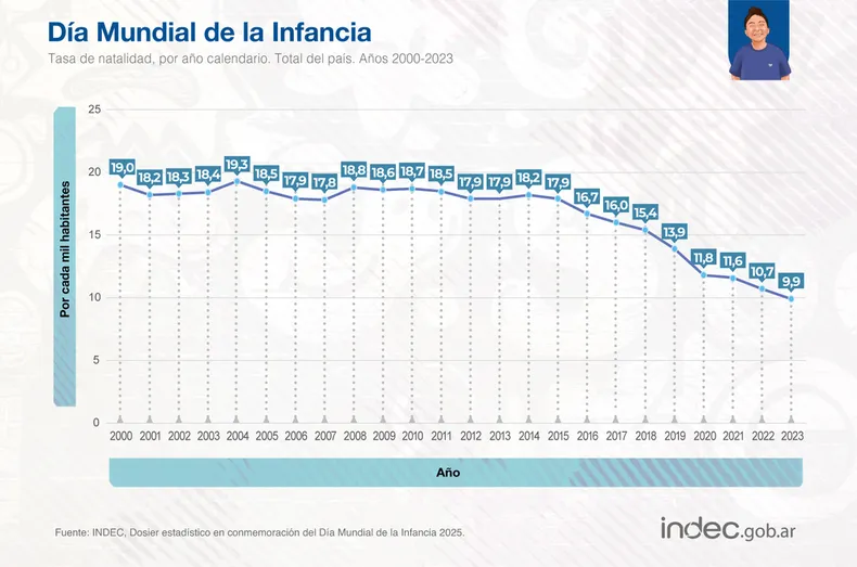 Mientras que en 1991 el 56% de los hogares tenía menores, en 2022 el porcentaje cayó a casi el 45%. Entre 2000 y 2014, la tasa de natalidad se mantuvo estable (18 a 19 nacidos vivos por mil habitantes), pero desde entonces comenzó un descenso sostenido hasta 9,9 en 2023, casi la mitad de los niveles del inicio del siglo.