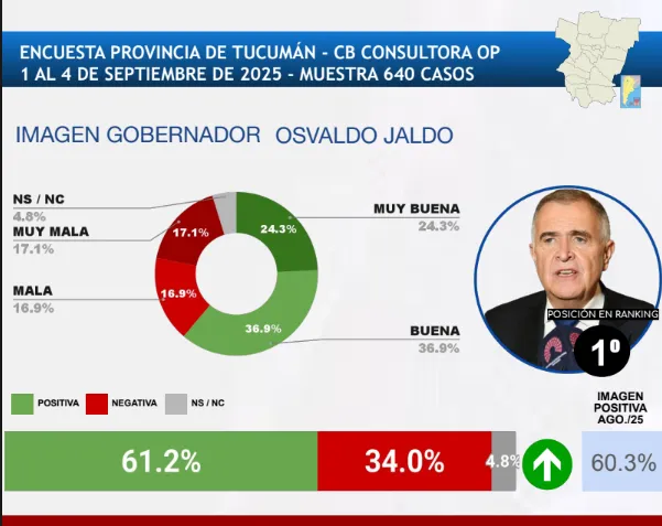 El resultado se da en un contexto de alta atención política, a pocas semanas de las elecciones nacionales. El relevamiento incluyó una muestra de 640 casos en Tucumán, realizada entre el 1 y el 4 de septiembre de 2025. Los números consolidaron el ascenso del gobernador, quien en julio había ocupado el segundo lugar con un 60,3% de aprobación.