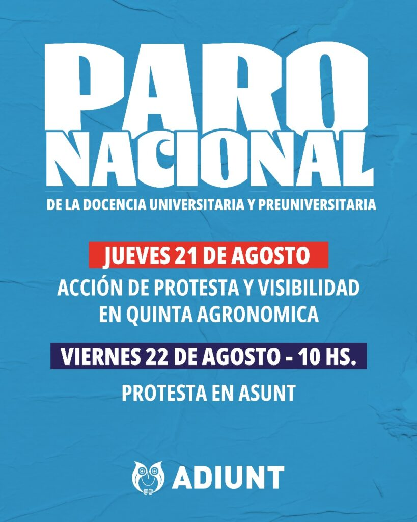 Ariel Osatinsky, secretario de Finanzas de la Asociación de Docentes e Investigadores de la UNT (ADIUNT), confirmó la convocatoria al paro: “La cuestión salarial no da para más”, afirmó, al tiempo que denunció que un docente universitario gana en promedio 800 mil pesos mensuales, muy por debajo de la línea de pobreza, que actualmente ronda el 1.200.000 pesos: «más de 10 mil docentes ya abandonaron la actividad por no poder sostener sus condiciones de vida».
