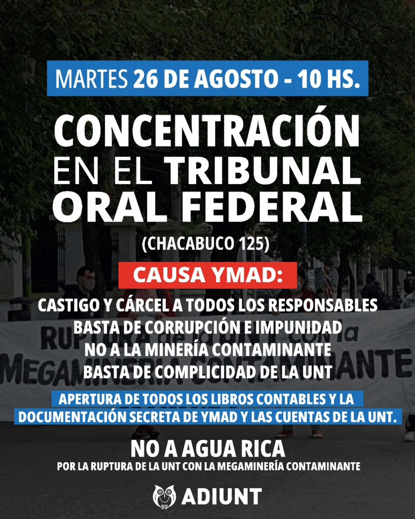 Desde la ADIUNT reclaman “castigo y cárcel a todos los responsables, basta de corrupción e impunidad, basta de complicidad de la UNT con los negociados de la megaminería”.