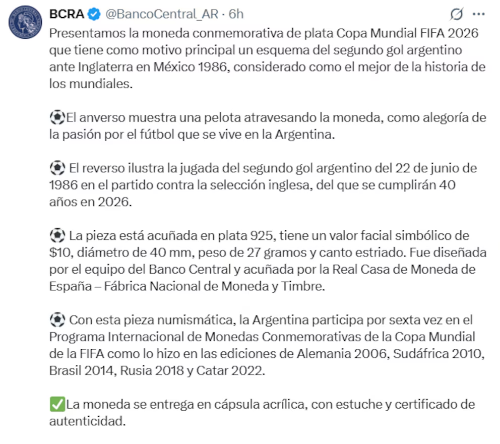 El Banco Central de la República Argentina (BCRA) emitió una moneda conmemorativa de plata dedicada a la Copa Mundial de la FIFA 2026, cuyo motivo principal es un esquema de la legendaria jugada del segundo gol argentino ante Inglaterra en México 1986, considerado como el mejor de la historia de los mundiales. “En 2026 se cumplirán 40 años de aquel hito deportivo”, explicaron desde la entidad.
