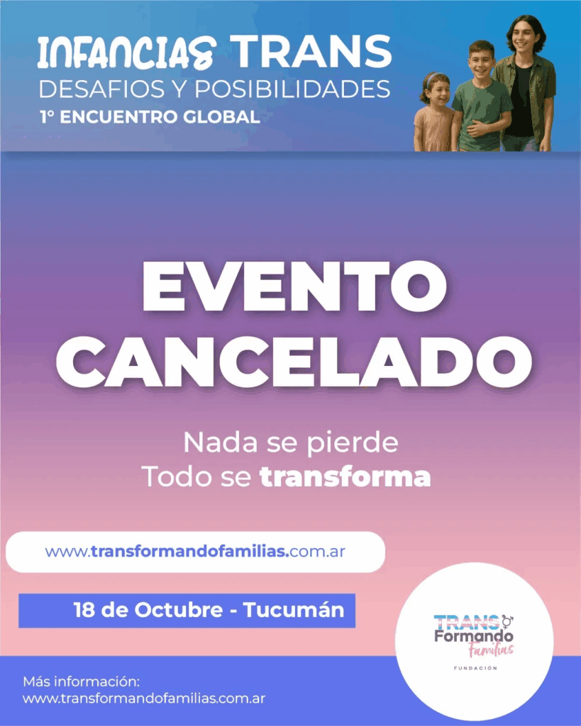 Tras varios días de polémica entre funcionarios, las redes sociales y el comentario de los tucumanos; la Fundación Transformando Familias anunció la cancelación del 1er Encuentro Global de Infancias Trans, que iba a realizarse el próximo sábado 18 de octubre en la capital tucumana, en medio de fuertes críticas de distintos sectores que cuestionaron la temática del evento.
