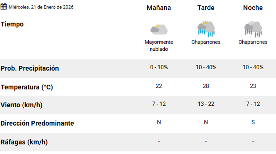 Según el pronóstico oficial, la temperatura mínima será de 21 grados y la máxima alcanzará los 28°, en un contexto de ambiente templado a cálido. A lo largo de la jornada se espera cielo nublado, sin cambios bruscos en las condiciones generales.
