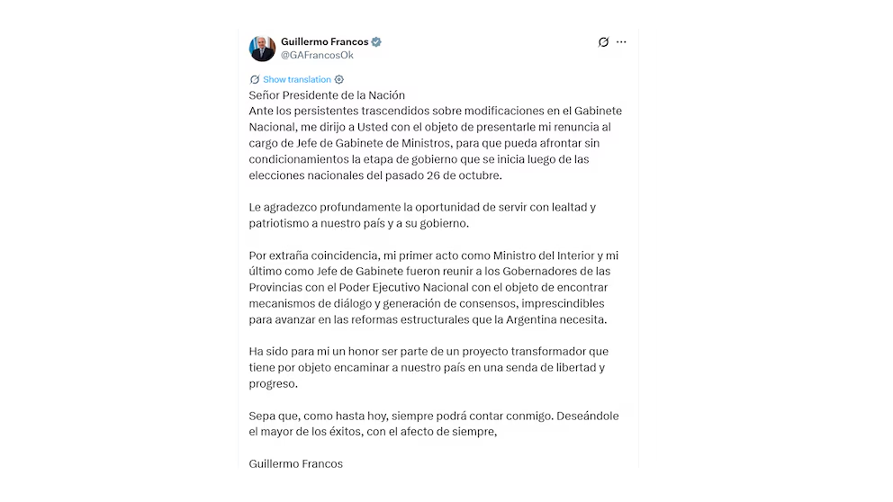 La decisión se produce luego de semanas de rumores sobre cambios en el Gabinete Nacional. Francos explicó que su salida busca facilitar la nueva etapa de gobierno que comienza tras las elecciones del 26 de octubre. El presidente Milei agradeció públicamente su labor, destacando su rol clave en la aprobación de leyes como la Ley Bases y la Ley Antimafias.