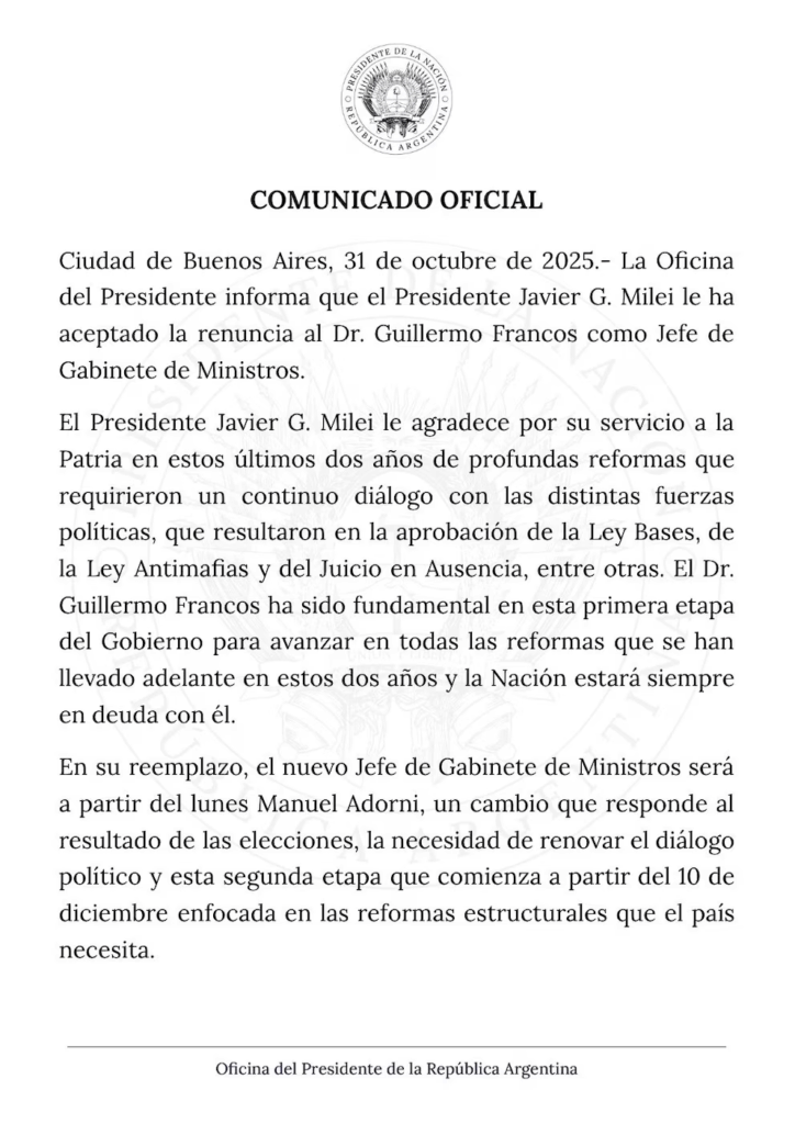 La decisión se produce luego de semanas de rumores sobre cambios en el Gabinete Nacional. Francos explicó que su salida busca facilitar la nueva etapa de gobierno que comienza tras las elecciones del 26 de octubre. El presidente Milei agradeció públicamente su labor, destacando su rol clave en la aprobación de leyes como la Ley Bases y la Ley Antimafias.