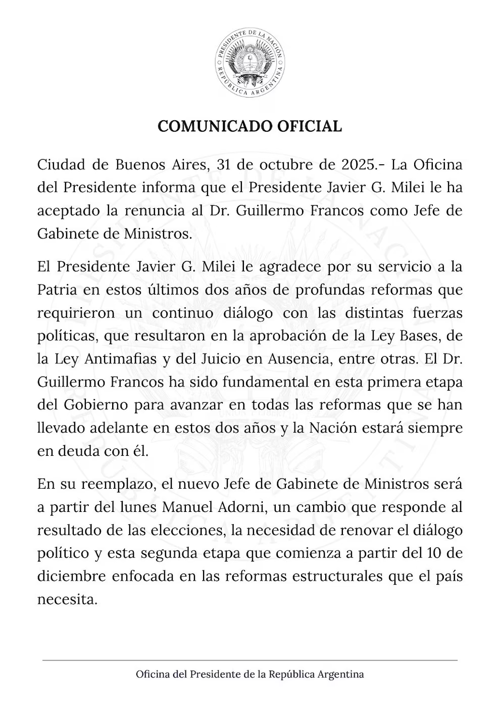 El reemplazo de Francos será Manuel Adorni, actual secretario de Comunicación y Medios. Según fuentes oficiales, el nombramiento responde a la necesidad de renovar el diálogo político y encarar una segunda etapa centrada en reformas estructurales. Esta fase comenzará formalmente el 10 de diciembre, con el objetivo de profundizar los cambios impulsados por el gobierno.