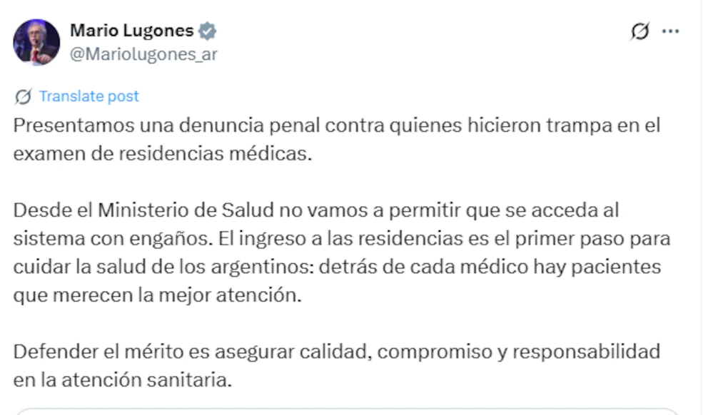Según confirmaron fuentes del ministerio a Infobae, la denuncia penal fue presentada por el ministro Mario Lugones ante la Cámara Nacional de Apelaciones en lo Criminal y Correccional Federal. Aspirantes con antecedentes académicos bajos fueron favorecidos con puntajes inusualmente altos, distorsionando así el orden de mérito y provocando un riesgo para la salud pública, al permitir el acceso a cargos médicos mediante prácticas desleales.