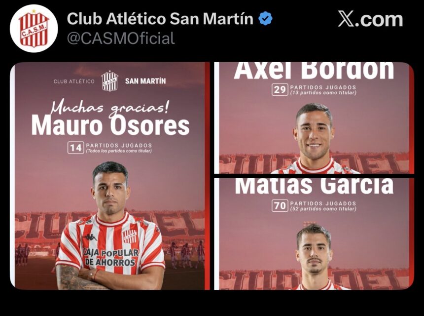 El Club Atlético San Martín informó oficialmente que once jugadores finalizaron su vínculo contractual y dejaron de pertenecer a la institución, en el marco del proceso de reestructuración del plantel de cara a la próxima temporada.