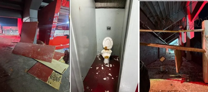 Los pasillos del estadio Libertadores de América se convirtieron en un escenario de guerra: baños destruidos, rejas arrancadas, chapones usados como proyectiles y manchones de sangre en el suelo. También vandalizaron puestos de comida y atacaron el micro del equipo chileno mientras los jugadores permanecían adentro.