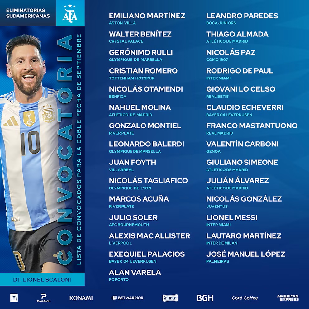 Lionel Messi vuelve tras superar una lesión en Inter Miami y anunció que el duelo ante Venezuela será su último partido de Eliminatorias en suelo argentino. También regresan Marcos Acuña, Gonzalo Montiel y Leandro Paredes, los únicos representantes del fútbol local. Enzo Fernández quedó fuera por expulsión, mientras que jóvenes como Claudio Echeverri, Nicolás Paz y Franco Mastantuono repiten en la lista.