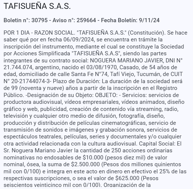 El legislador Noguera completó el trámite de constitución de la productora “TAFISUEÑA” el 11 de septiembre de 2024, cuando el edicto correspondiente fue publicado en el Boletín Oficial de la Provincia.