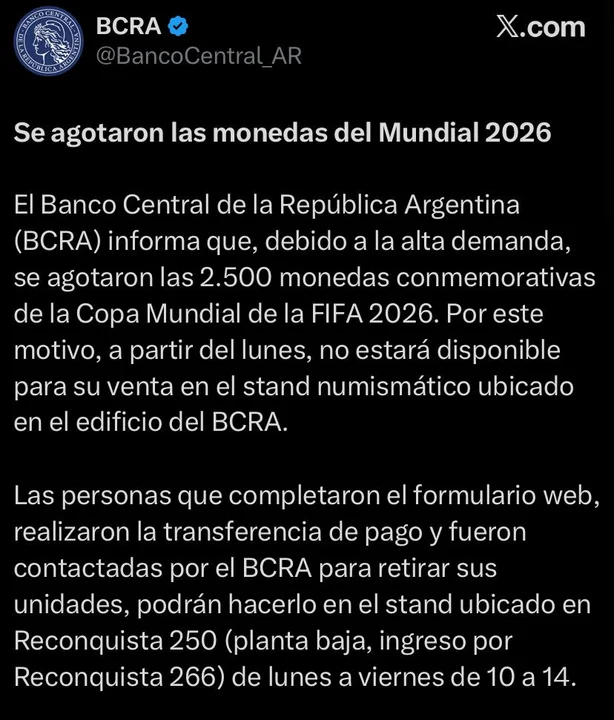A través de un comunicado publicado en su cuenta oficial de X, la entidad informó que el stand numismático ubicado en su edificio ya no ofrecerá la pieza, aunque quienes realizaron el trámite de compra podrán retirarla en Reconquista 250, de lunes a viernes entre las 10 y las 14.