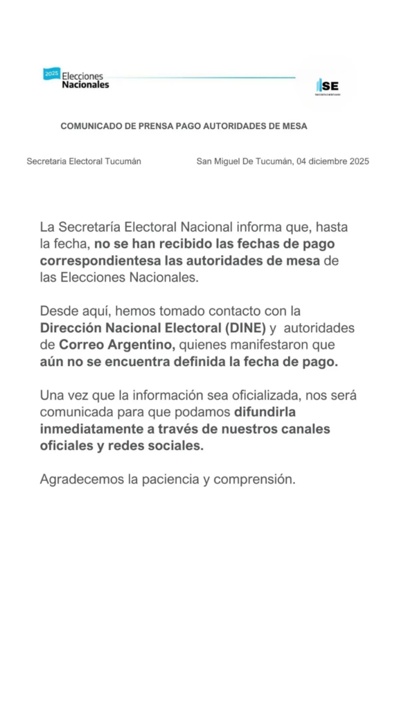 La Secretaría Electoral Nacional informó que el Correo Argentino y la Dirección Nacional Electoral (DINE), aún no definieron la fecha de pago de autoridades de mesa y delegados, quienes cumplieron con dicha función en las Elecciones Legislativas del 26 de octubre pasado.