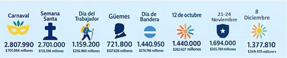 En el acumulado del año se registraron ocho fines de semana largos, durante los cuales se movilizaron 13.342.750 turistas por el país. Estas escapadas generaron un movimiento económico estimado en $2.971.578 millones, equivalente a aproximadamente US$2.030 millones al tipo de cambio considerado por el informe.