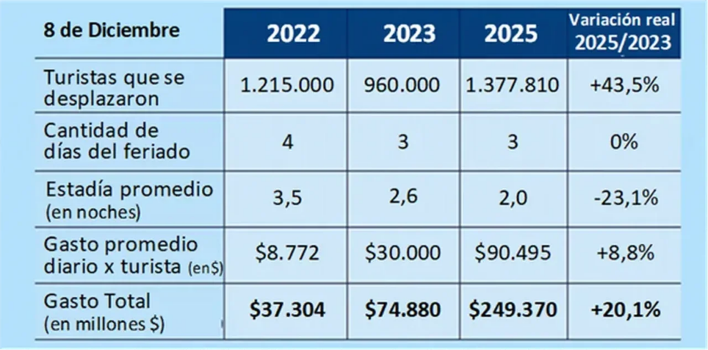 Según el informe de la Confederación Argentina de la Mediana Empresa (CAME), 1.377.810 turistas se movilizaron por el país durante el fin de semana largo por el Día de la Inmaculada Concepción, lo que representa un aumento del 43,5% respecto al año anterior. Aun con pronósticos de tormentas que afectaron a algunas regiones, la fecha se consolidó nuevamente como una de las más dinámicas del calendario turístico previo al verano.