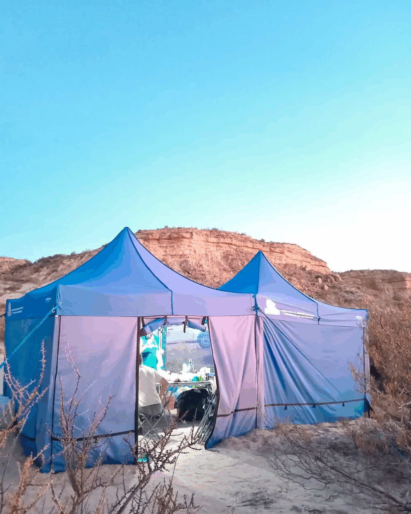 El campamento base, ubicado a 30 kilómetros de General Roca, será la sede de esta aventura científica donde ya se hallaron restos de al menos diez especies nuevas de animales. Entre ellos, una garra fósil que podría pertenecer a un dinosaurio carnívoro inédito, posiblemente una nueva especie para la ciencia.