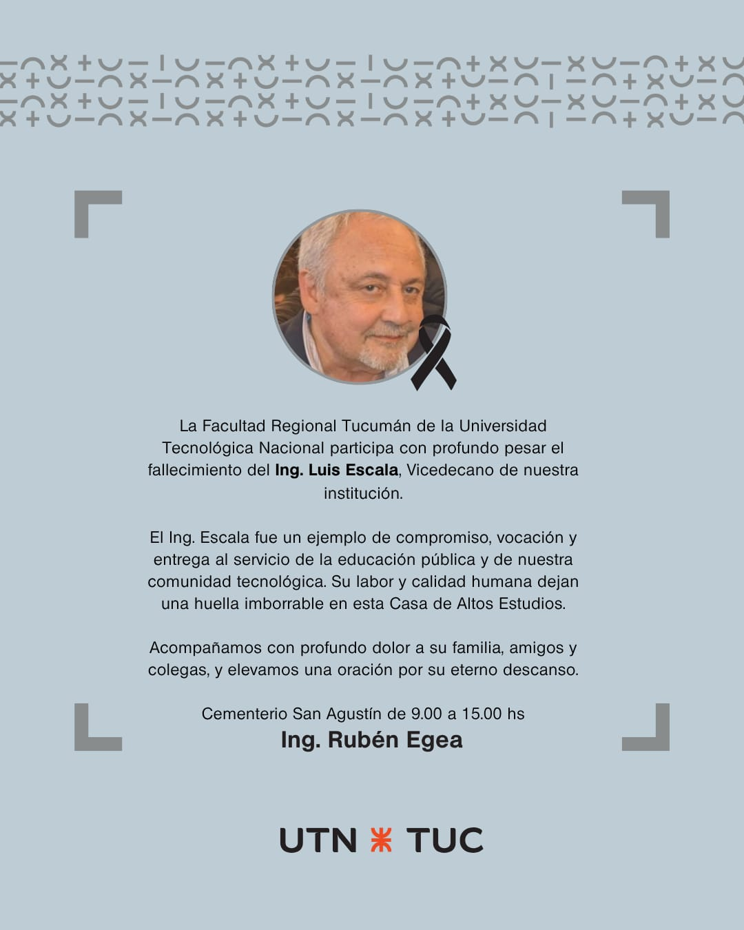 La comunidad educativa de la Universidad Tecnológica Nacional – Facultad Regional Tucumán (UTN-FRT) atraviesa un profundo dolor tras el fallecimiento del ingeniero Luis Escala, quien se desempeñaba como vicedecano y director de la carrera de Ingeniería en Energía Eléctrica.